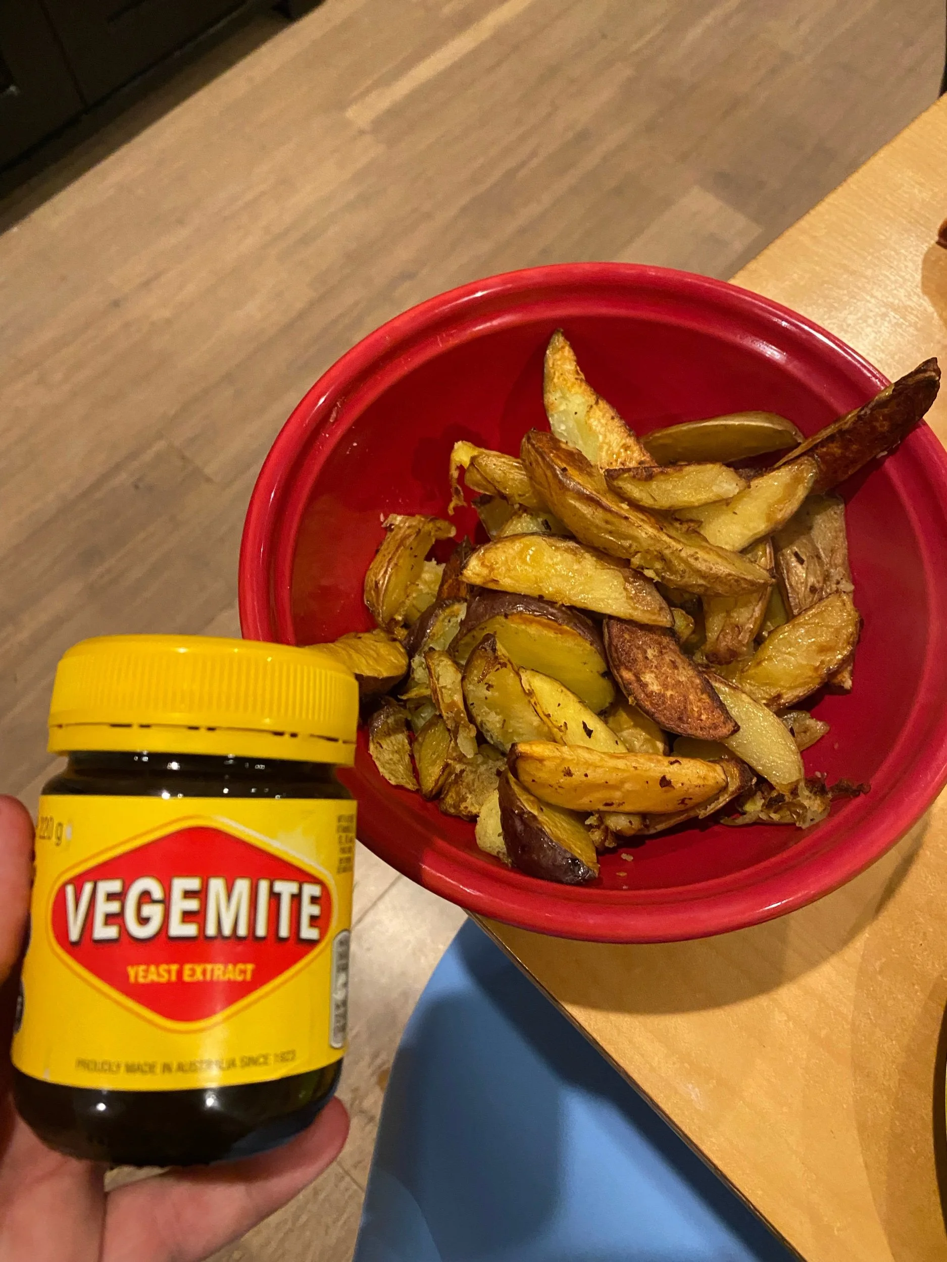 Vegemite-glazed potato wedges. We consulted this recipe, but decided that a wedge shape would work better as a side with burgers, and that we could leave them unpeeled.