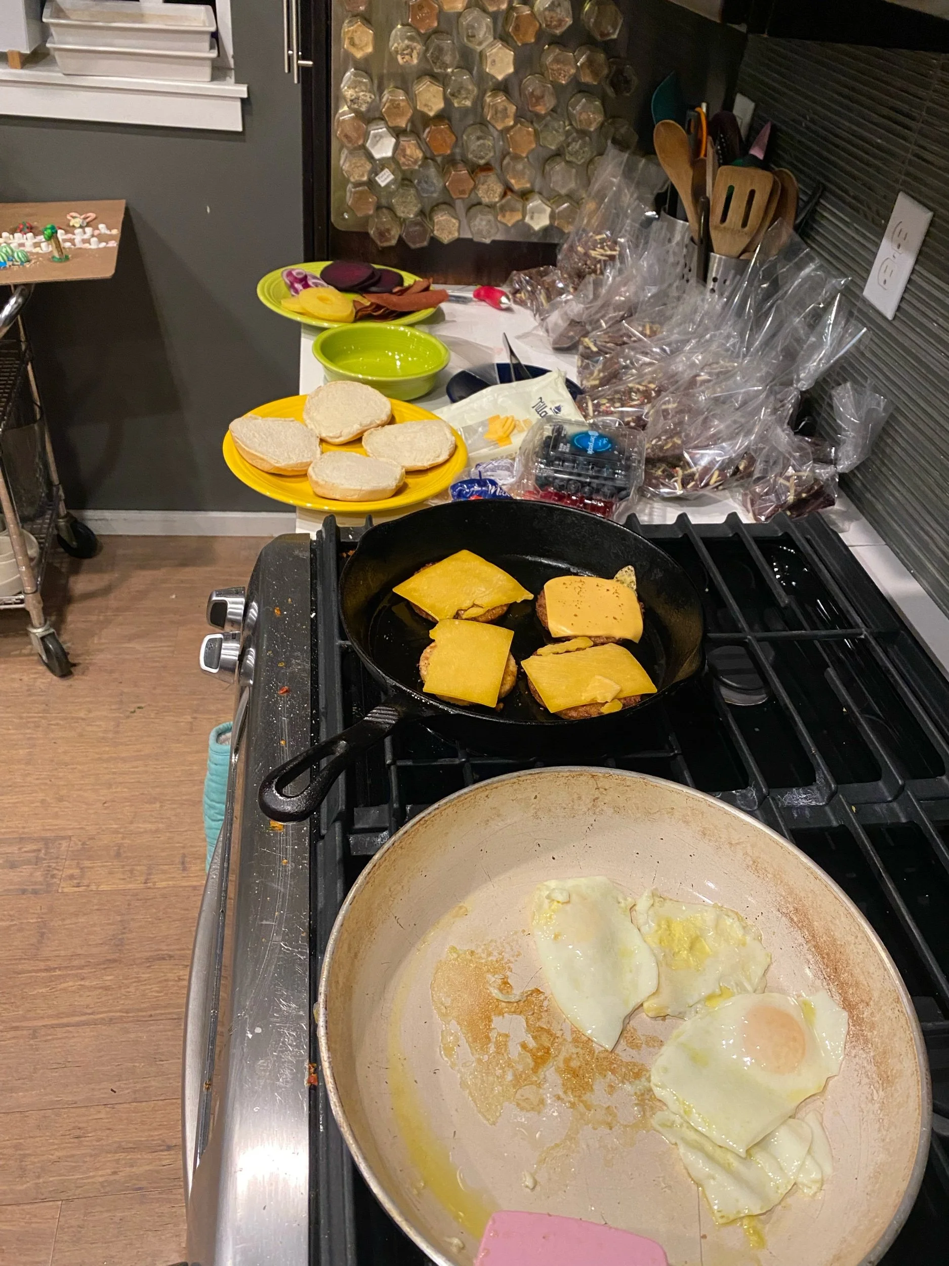 Aussie Burgers, which are like regular cheeseburgers, but with a slice of beet, a slice of pineapple ring, bacon, and a fried egg on them. Our Australian friend Annie made these for us three years ago, ands they’re great.