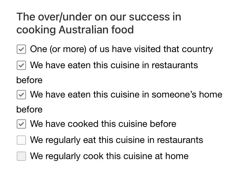 Fairy Bread, which is apparently just white bread with butter and sprinkles on it. This was okay. Like eating white toast with butter and crunchy sugar on it. The best part about making this dish was learning that Australians call nonpareil sprinkles “hundreds and thousands,” which is also what I will call them going forward.
